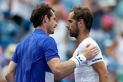 | Richard Gasquet console Andy Murray (droite), battu lors de son premier match de simple en sept mois, le 12 août, à Cincinnati, dans l'Ohio. |