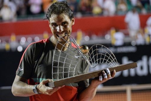 | L'Espagnol Rafael Nadal avec son trophée du tournoi de Rio de Janeiro, le 23 février. |