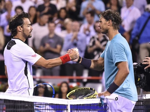 | L'Espagnol Rafael Nadal (droite) serre la main de l'Italien Fabio Fognini après l'avoir battu en quarts de finale du tournoi Masters 1000 de Montréal, le 9 août 2019. Photo: AFP/VNA/CVN |