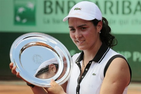 | Ons Jabeur titrée à Roland-Garros chez les juniors aux dépens de la Porto-Ricaine Monica Puig, le 5 juin. |