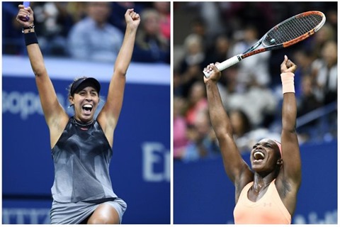 | Les Américaines Madison Keys (gauche) et Sloane Stephens célèbrent leur victoire le 7 septembre 2017 en demi-finale de l'US Open. |