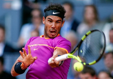 | Rafael Nadal renvoie la balle vers Dominic Thiem à Madrid, le 14 mai. |