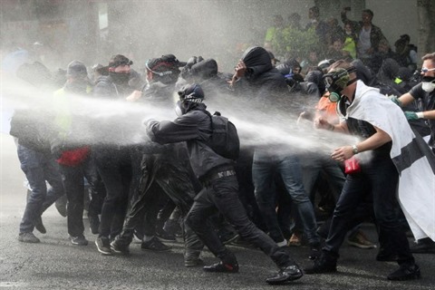 | Des manifestants en noir et cagoulés arrosés par des canons à eau lors de heurts avec les forces de l'ordre, le 1er mai à Paris. |