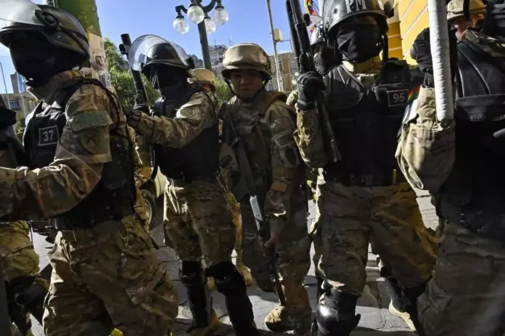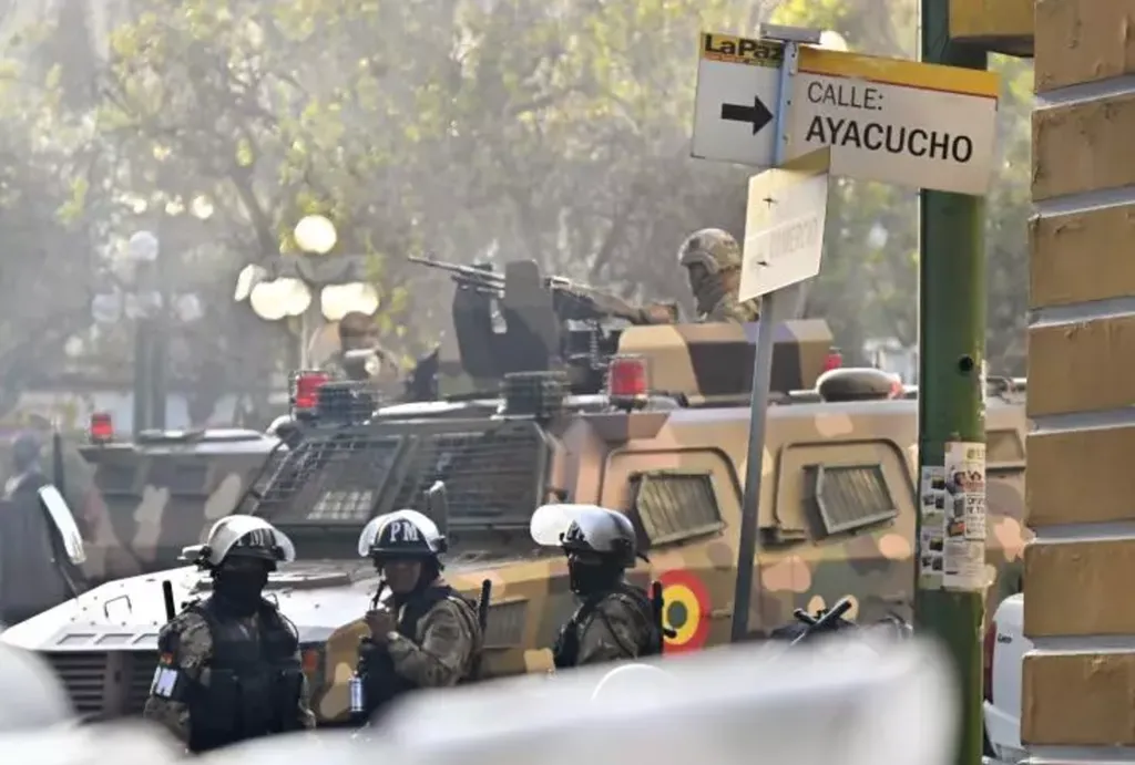 Dans la journée, le général et ses hommes avaient avancé en rangs serrés dans les rues de La Paz jusqu'à la place Murillo, où ils avaient positionné huit véhicules blindés et lancé des gaz lacrymogènes sur toute personne tentant de s'approcher.