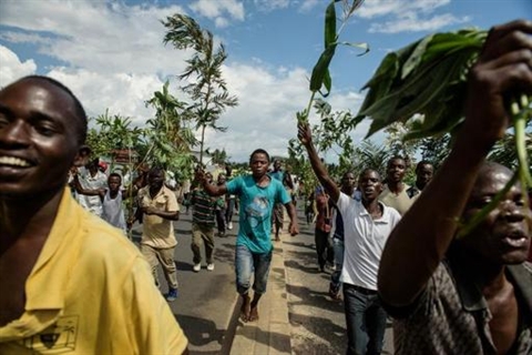 | Des Burundais manifestent leur joie dans Bujumbura après l'annonce du coup d'État le 13 mai. |