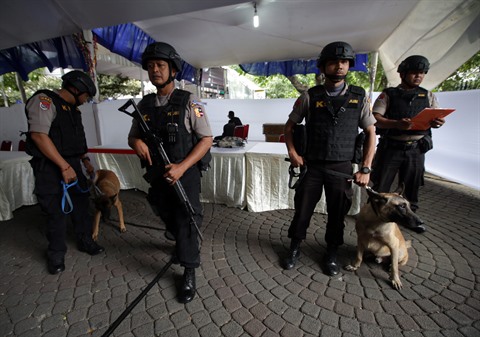 | La police indonésienne renforce la sécurité au théâtre en banlieue de Jakarta, le 24 décembre. |