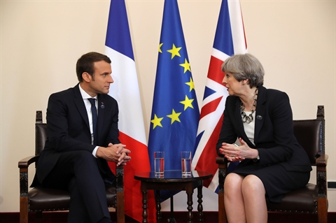 | La Première ministre britannique Theresa May et le président français Emmanuel Macron lors d'une entrevue en marge du sommet du G7, le 26 mai à Taormina, en Sicile. |