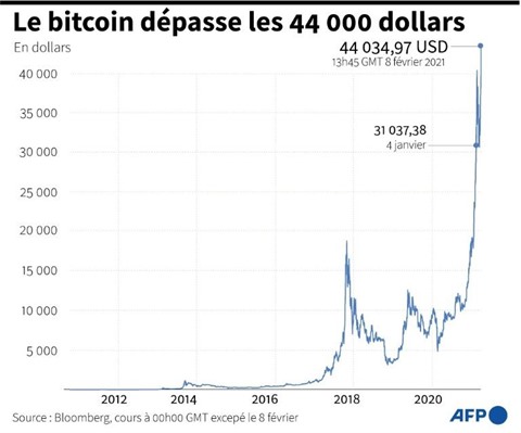 Dans la foulée de cette annonce, le cours de la cryptomonnaie s'est envolé jusqu'à 44.768,36 USD à 13h25 GMT, un record.