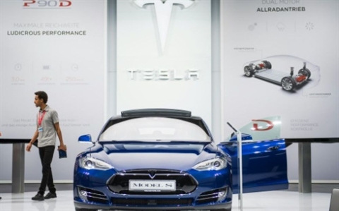 | Une Model S de Tesla lors d'un salon automobile, le 16 septembre 2015 à Francfort, en Allemagne. |