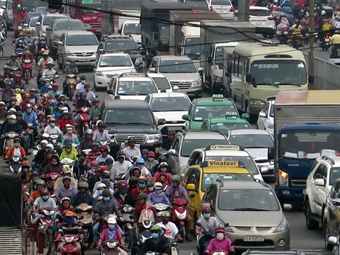 | Un grand bouchon sur la route nationale 13 traversant le pont Binh Triêu, à Hô Chi Minh-Ville. |