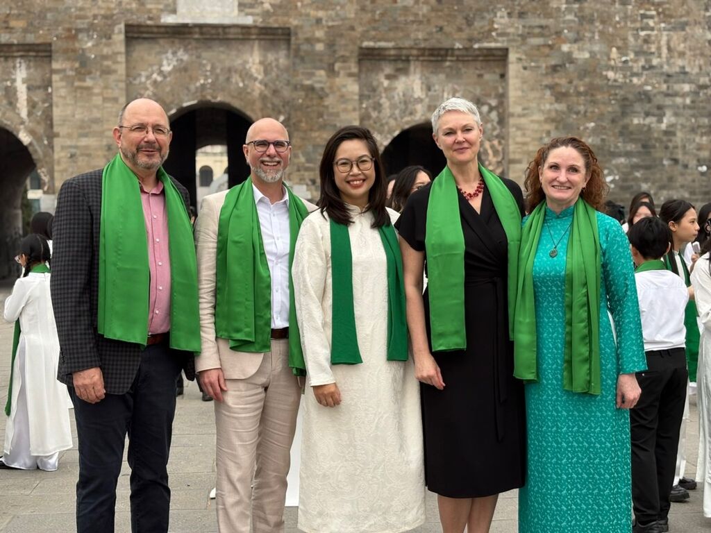 | La cheffe du chœur Gió Xanh, Nguyên Hai Yên, au milieu des ambassadrices et ambassadeurs du Groupe des Quatre (G4) à Hanoï. |