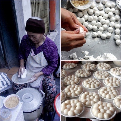 Pour les bánh trôi (gâteaux flottants), on va former des boulettes de taille d’un œuf de caille en plaçant au centre un morceau de sucre brunâtre. Cette étape exige habileté et patience pour avoir des boulettes bien rondes et lisses. Elles sont ensuite cuites dans de l’eau bouillante à feu moyen jusqu’au moment où elles se mettent à flotter. On peut alors les retirer avec une grande cuillère percée de trous. Puis, elles sont mises dans une assiette et saupoudrées par les graines de sésame dorées. Chaque assiette comporte environ 13-15 boulettes.