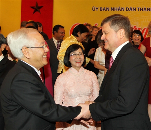 | Le président du Comité populaire de Hô Chi Minh-Ville, Lê Hoàng Quân (gauche), a adressé ses meilleurs vœux de Nouvel An aux amis étrangers. |