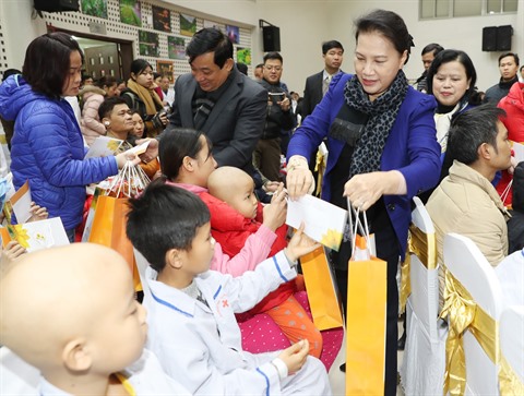 | La présidente de l’Assemblée nationale Nguyên Thi Kim Ngân remet des cadeaux aux petits cancéreux. |