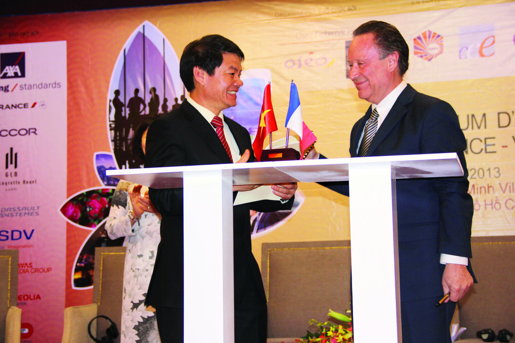 | Le Pdg de THACO, Trân Bá Duong (gauche), et le président de Peugeot Asie, Jean-Yves Dossal, lors de la cérémonie de signature de l’accord de coopération entre les deux sociétés. |