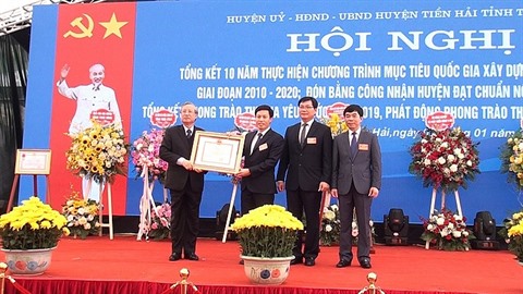 | Le membre du politburo et permanent du secrétariat du Comité central du Parti, Trân Quôc Vuong (gauche), a décerné un certificat attestant que le district de Tiên Hai a atteint les normes de la Nouvelle Ruralité. |