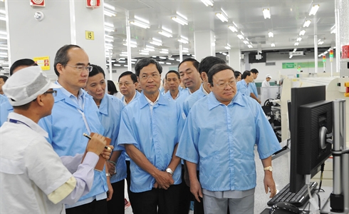 | Le président du Comité central du Front de la Patrie du Vietnam, Nguyên Thiên Nhân, (2e, gauche) visite la compagnie Samsung Electronics Vietnam Thai Nguyên, le 15 août. |