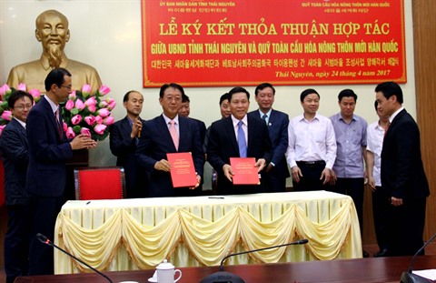 | La cérémonie de signature de l'accord de coopération entre le Comité populaire de Thai Nguyên (Nord) et le Fonds Saemaul de la République de Corée, le 24 avril à Thai Nguyên. |