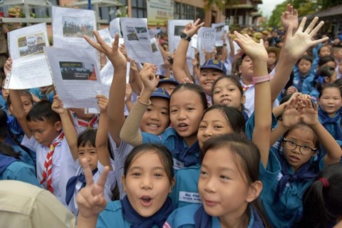 | Des écoliers thaïlandais fêtent l'évacuation des jeunes gens bloqués 18 jours dans une grotte inonée, le 11 juillet à Chiang Rai. |
