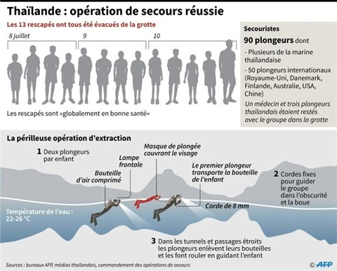 Les autorités thaïlandaises ont longtemps été peu disertes sur le déroulement de l'évacuation. Comment 12 garçons de 11 à 16 ans dont aucun ne pratique la plongée et certains ne savent pas nager ont-ils pu s'extraire d'une grotte aux étroits passages, ponctuée de boyaux inondés à la visibilité nulle? Un plongeur thaïlandais, à court d'air, est notamment mort au cours des préparatifs à l'évacuation.
