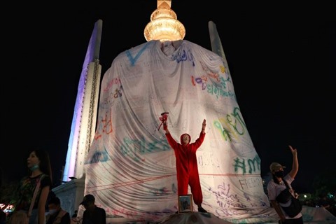 "Vous êtes en train de me voler mon brillant avenir", affirmait un message. "La démocratie va gagner", disait un autre. "C'est un acte symbolique de libre expression", a affirmé à l'AFP Pearl, une graphiste de 25 ans, qui regardait un groupe de protestataires utiliser une échelle pour escalader le monument haut de trois mètres, surmonté d'une tourelle, au son du tambour de musiciens.
