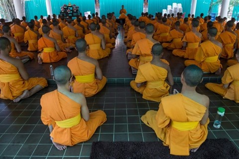 | Des moines bouddhistes prient dans le temple Dhammakaya, près de Bangkok, le 1er mars. |