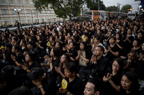 | Des Thaïlandais prient pour le défunt roi Bhumibol Adulyadej, lors d'une procession, le 29 octobre à Bangkok. |