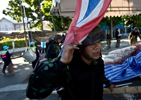 | Des soldats thailandais en train de repousser des manifestants anti-gouvernementaux, le 23 mai à Bangkok. |