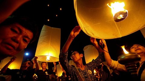 | Des gens enflamment des lanternes à Chiang Mai, en Thaïlande. |