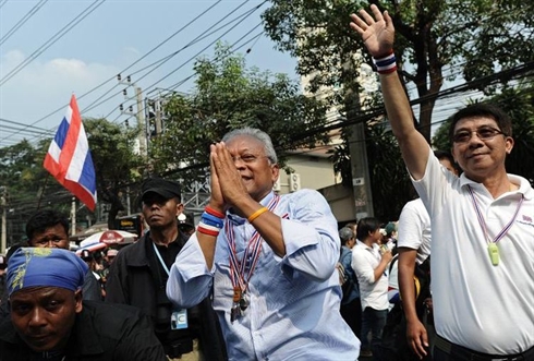 | Le leader des manifestants de l'opposition, Suthep Thaugsuban (centre), le 10 février à Bangkok. |