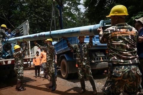 | Des techiciens transportent des tuyaux de pompage près de la grotte de Tham Luang où sont piégés douze enfants et leur entraîneur de football, le 1er juillet 2018 à Chiang Rai, en Thaïlande. |