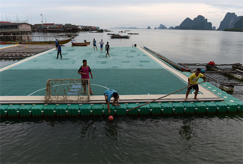 À Panyee, dans la région de Phanga Nga, dans le Sud de la Thaïlande, les visiteurs étrangers continuent d’affluer grâce à l’attraction que constitue le terrain de foot. Installé près de la jetée de l’île, sur de grosses piles flottantes reliées par des cordes, ce terrain de 16 sur 25 mètres s’est révélé une aubaine pour le développement local depuis sa construction en 2010 à l’occasion d’une campagne publicitaire pour une banque.