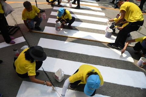 | Des employés de la poste thaïlandaise repeignent un passage piétons devant leurs bureaux à l'approche du couronnement du roi, à Bangkok le 25 avril. |