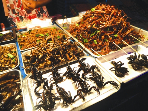 | Chaque soir, des centaines de touristes se laissent tenter par des insectes frits vendus par les marchands ambulants de la rue Khao San. |