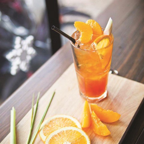 - le jus d’orange dans le thé, ajouter les morceaux de pêche, trois cuillères à café de sucre (à ajuster selon les goûts), trois cuillères à café de sirop de pêche, la tranche d’orange.