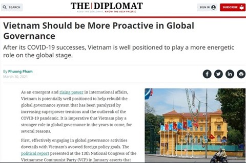 Sur ke site https://thediplomate.com, l'article indique qu’après ses succès contre le COVID-19, le Vietnam est bien placé pour jouer un rôle plus énergique sur la scène mondiale et qu’il est impératif que le Vietnam joue un rôle plus important dans la gouvernance mondiale dans les années à venir, pour plusieurs raisons. Premièrement, s’engager efficacement dans des activités de gouvernance mondiale va de pair avec les objectifs déclarés de la politique étrangère du Vietnam, précise-t-il.