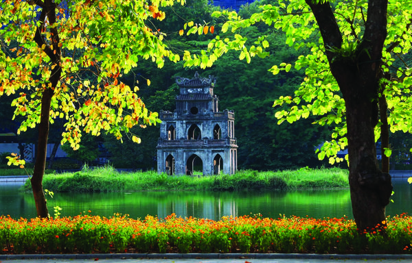 | Corbeille de fleurs au cœur de Hanoï, le lac de l'Épée restituée est un emblème de la ville millénaire. |