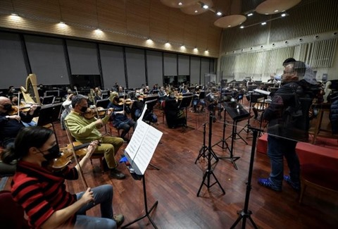 | Les musiciens du Théâtre Royal de Madrid, lors d'une répétion, le 14 janvier 2021. |