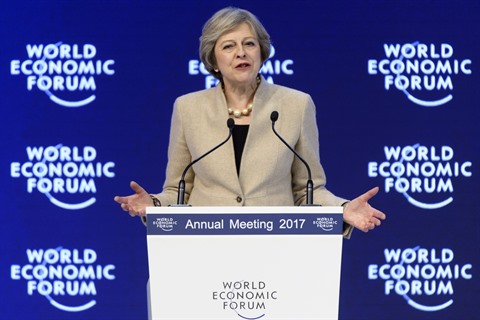 | La Première ministre britannique Theresa May s'exprime au Forum économique mondial à Davos, en Suisse, le 25 janvier 2017. |