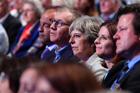 | La Première ministre britannique Theresa May (3e à gauche), le 1er octobre à l'ouverture du Congrès des conservateurs à Manchester |