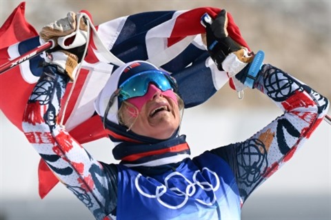 | La Norvégienne Therese Johaug célèbre sa médaille d'or dans l'épreuve féminine de ski de fond libre 30 km à départ groupé, lors des Jeux olympiques d'hiver de Pékin 2022, au Centre national de ski de fond de Zhangjiakou, le 20 février. |
