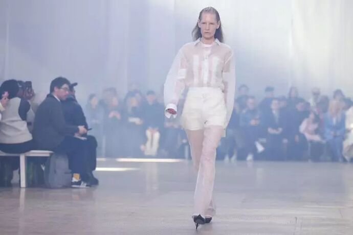 Pendant qu'une voix féminine lisait les vers, la collection automne 2024 a déployé ses deux couleurs majeures, le noir et le blanc, sur des mannequins marchant lentement, mi-humains mi-animaux avec leurs voiles ou masques de plumes sur les visages ou la tête surmontée d'antennes, de bois de cervidés, ou de tresses suspendues en l'air. Dans cet univers un peu angoissant, les deux couleurs se croisent, parfois en damiers, sur de longs manteaux aux épaules militaires.