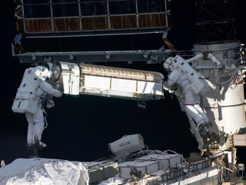 | Les astronautes Shane Kimbrough et Thomas Pesquet en train d'installer un nouveau panneau solaire sur la Station spatiale internationale lors d'une sortie dans l'espace en juin. |