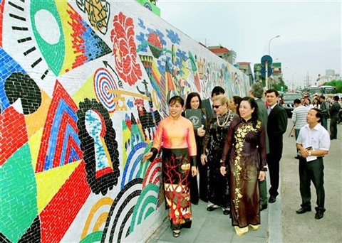 | La peintre Nguyên Thu Thuy (gauche) et la "Route en céramique au bord du fleuve Rouge", son projet pour fêter le Millénaire de Thang Long-Hanoï en 2010. |