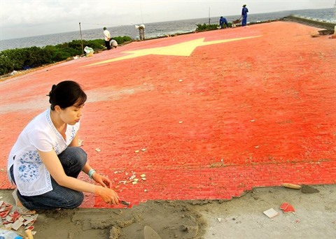 | La peintre Thu Thuy et le drapeau national en céramique à Truong Sa. |