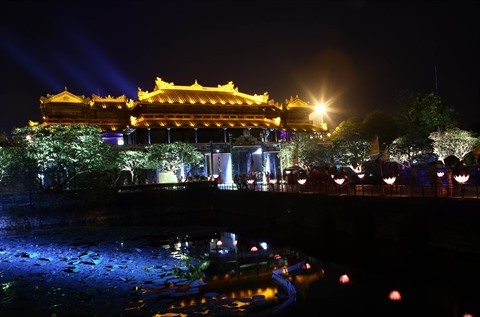 | La beauté splendide de Dai Nôi (Grand intérieur) de la citadelle de Huê dans la nuit. |