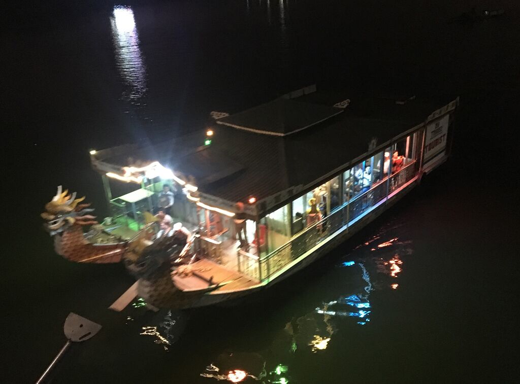 | Un bateau-dragon dans la rivière des Parfums, à Huê. |