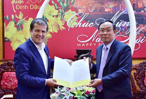 | Le président du Comité populaire de Thua Thiên-Huê, Nguyên Van Cao (droite), remet la licence d’investissement au président du groupe espagnol PSH, Gregorio Pérez |