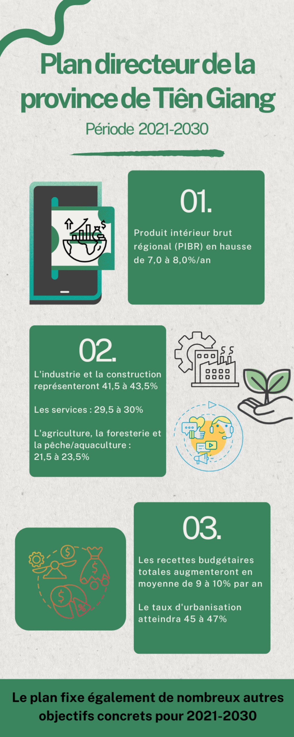 L'objectif est que d'ici 2030, Tiên Giang deviendra fondamentalement une province industrielle, dotée d'un système d'infrastructures synchrone et moderne, avec des régions dynamiques et un centre économique fort pour l'industrie, le tourisme, l'économie maritime et urbaine. Elle devait jouer un rôle de liaison important entre le delta du Mékong, Hô Chi Minh-Ville et la région Sud-Est. Elle devra assurer sa défense nationale, sa sécurité, son ordre et sa sécurité sociale, et faire en sorte que les habitants locaux aient une vie prospère, civilisée et heureuse.