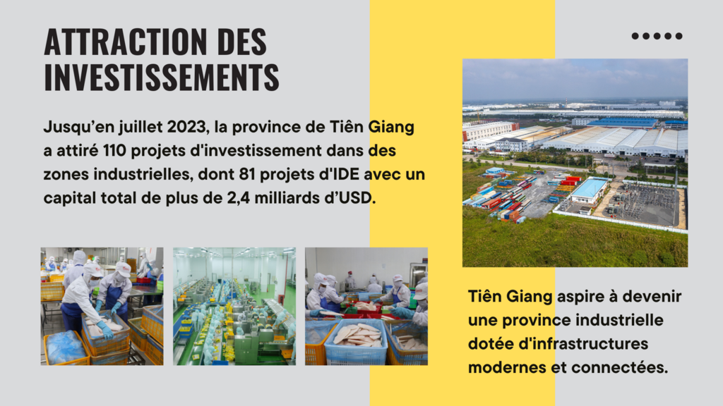 Tiên Giang a le but de mobiliser un maximum de ressources pour son développement socio-économique, notamment en attirant les investissements dans les projets d'infrastructures économiques et techniques. Elle mettra l’accent sur un environnement d'investissement véritablement dynamique, améliorant le niveau de satisfaction des investisseurs.